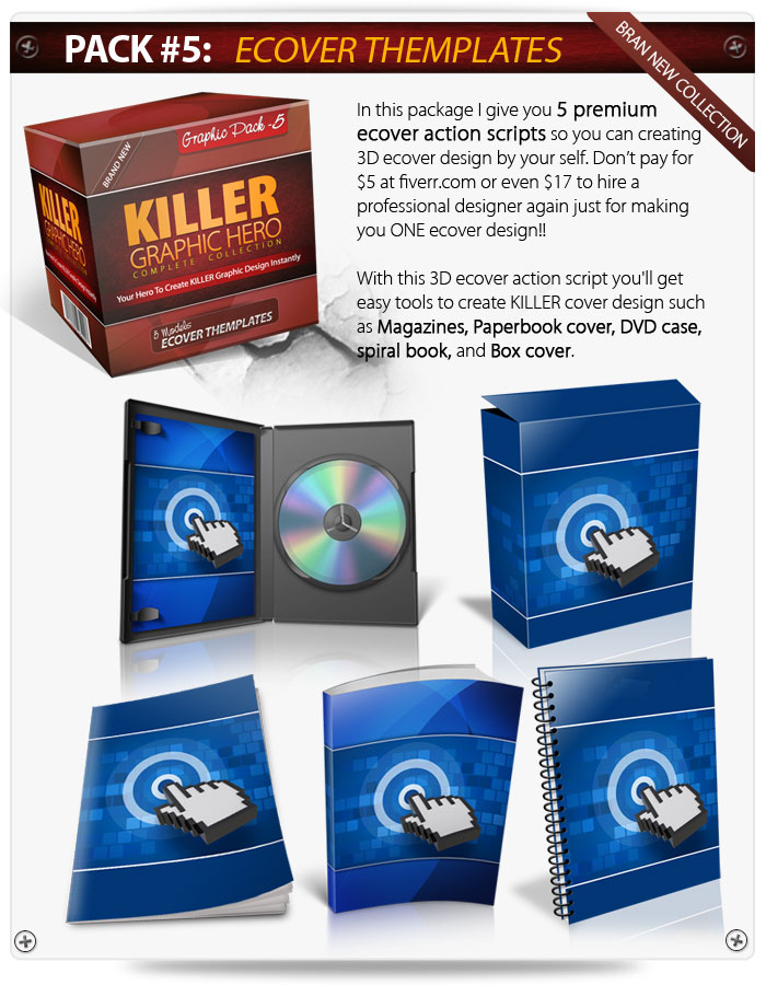 Pack 5: Ecover action scripts you can use to create killer cover design such as Magazines, Box cover, DVD case, Spiral book etc
