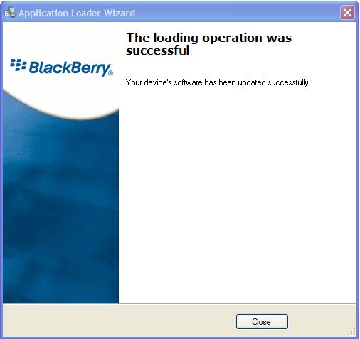 This stage took over thirty minutes (do not disconnect your BlackBerry phone during this time) and after series of screens, I saw “The loading operation was successful” screen.