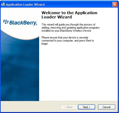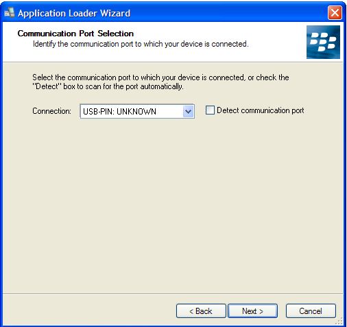 ==> I connected my BB to my laptop using the USB cable and clicked “Next” on the Application Loader Wizard main screen