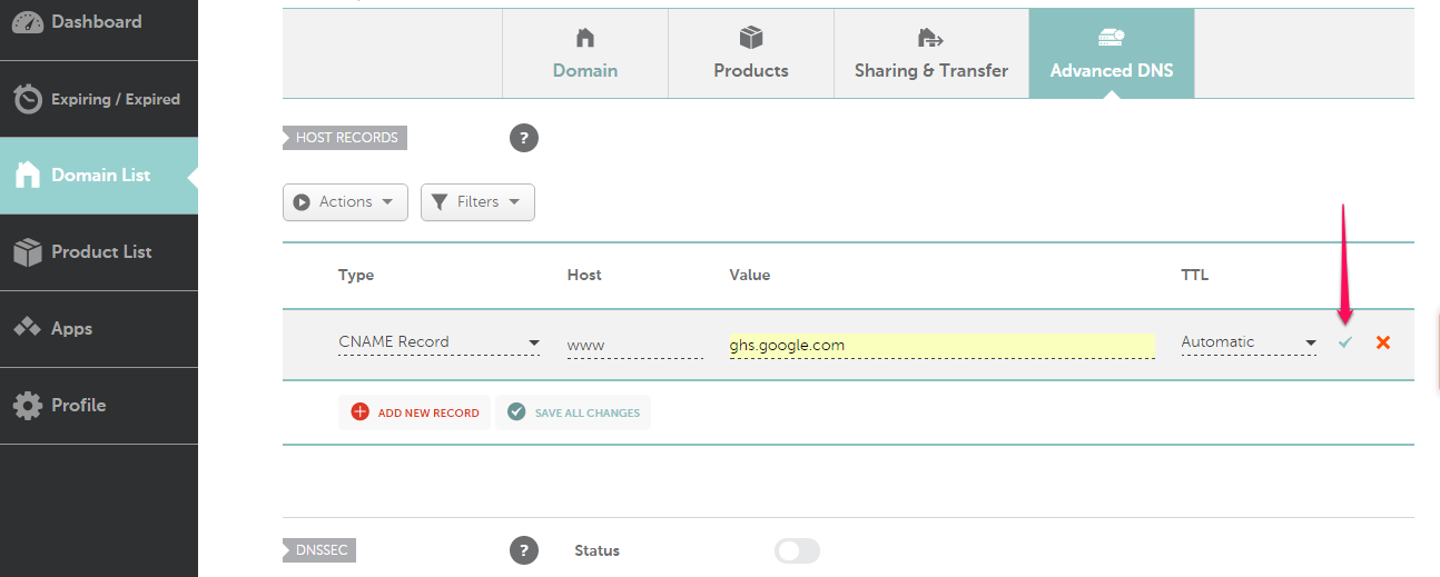 Type “ghs.google.com” in the “value” field and save as seen in screenshot below :