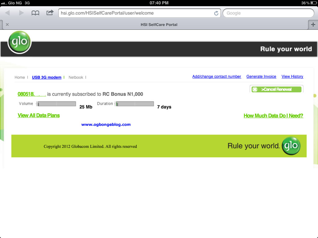If you access the Glo HSI page via your iPad safari browser after recharging with N500, N1000 or N1500, you will see your bonus as seen in the picture above.