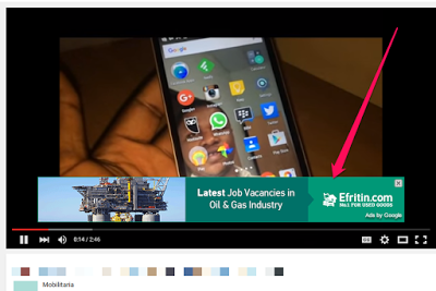 When your YouTube videos are viewed on desktop computer, the google ad can appear on the right of the feature video and above the video suggestions list. It can also appear as semi-transparent overlay ad that appears on the lower 20% portion of your video as seen above.