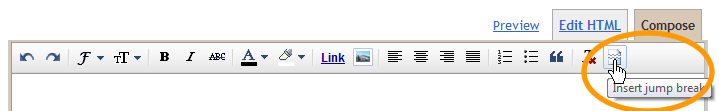If you use the new post editor (available on Blogger in Draft, or by enabling it via the Settings tab), you’ll notice the “Insert jump break” icon in the editor’s toolbar. Click this icon and the “jump break” will be inserted into your blog post at your cursor’s position.
