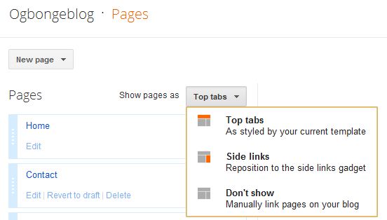 The “Show Pages as” tab is what you will use to control where you want your navigation tabs to appear on your blog. You can set it to appear under your header (Top tabs) or on the sidebar (Side links).