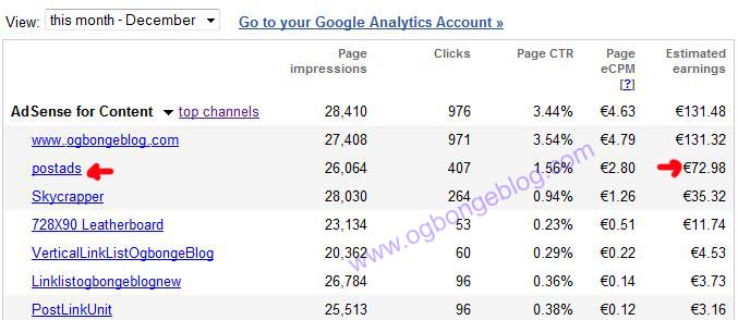 Below is a snapshot from my account, showing my earnings so far within the 15 days in December 2010. Take a close look at the analysis in the picture and you will see that the “Postads” channel is making sense. I created the “Postads” channel for the 300×280 Adsense ad inside my post. If you don’t know about channels, you still have a lot to learn about Adsense then. I have 3 great ebooks that can help you asap, just for N1000. You can pay me via Liberty reserve or Paypal too. Contact me if interested.