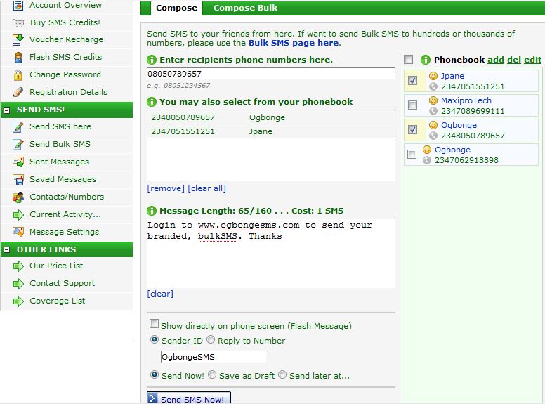With SMS platforms like www.ogbongesms.com , you can easily send Bulk SMS to mobile phone numbers with just a click of a mouse. Ogbongesms.com has a simple interface from where you can easily send your bulk SMS without having to download any software to the computer. With Ogbongesms.com, bulkSMS is delivered to mobile networks in Nigeria and other countries. The Full coverage list is available at www.ogbongesms.com