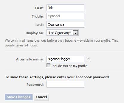 The “NigerianBlogger” enclosed in bracket in the picture above is the alternate name I used for this Facebook profile of mine. The alternate name will also show up next to your