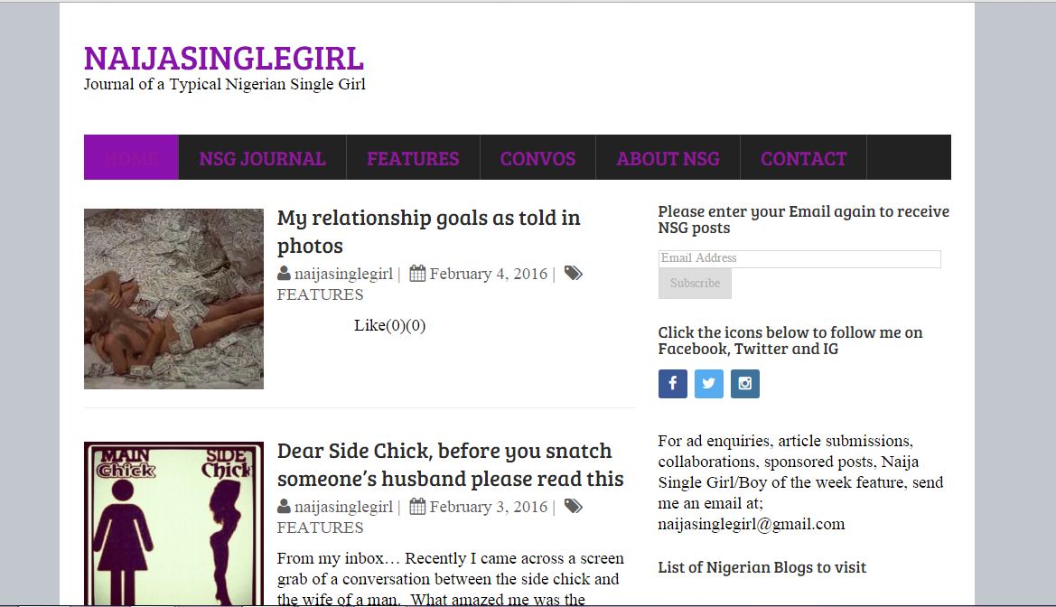 Naijasinglegirl blog is run by the self-acclaimed ‘Chairlady of single girls in Nigeria’ popularly known as NSG.